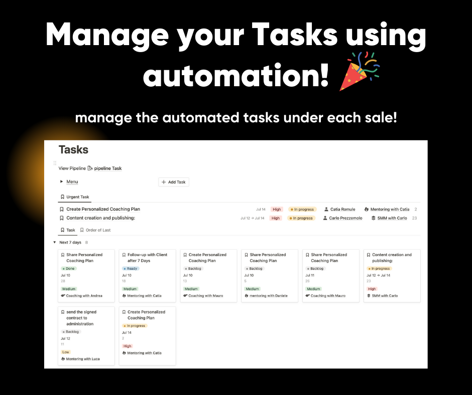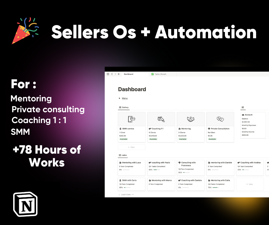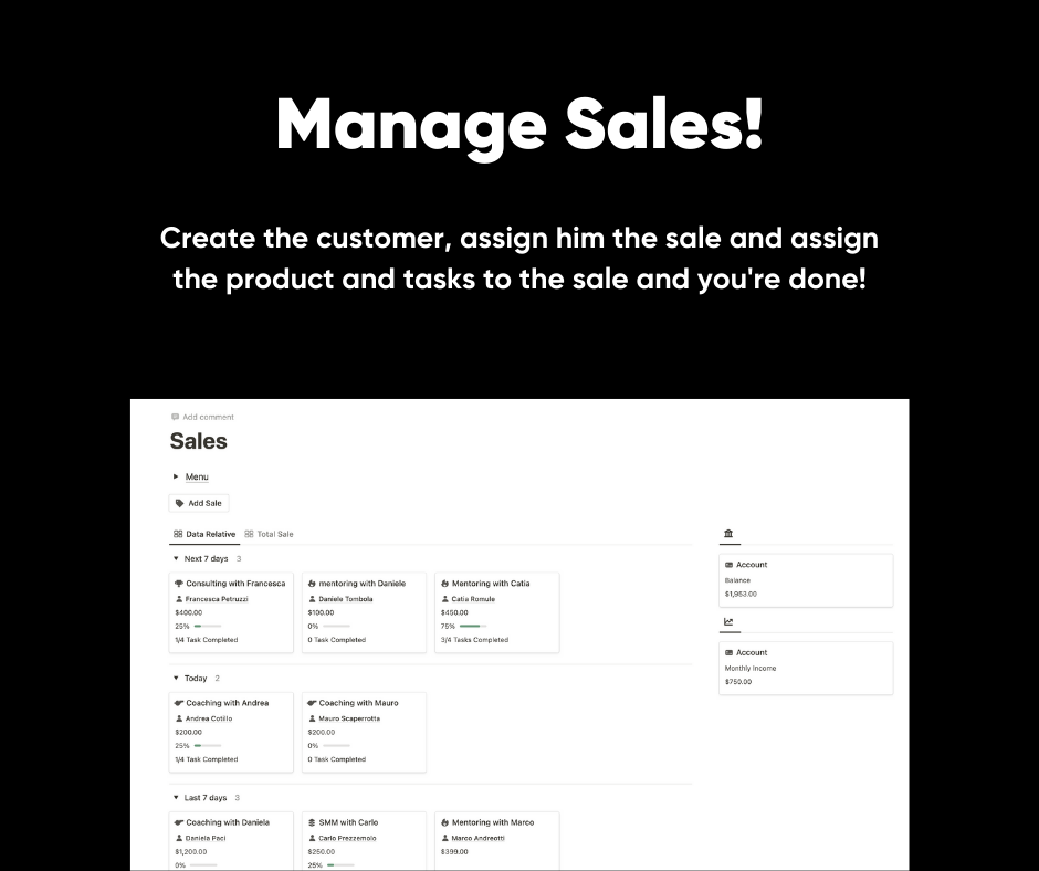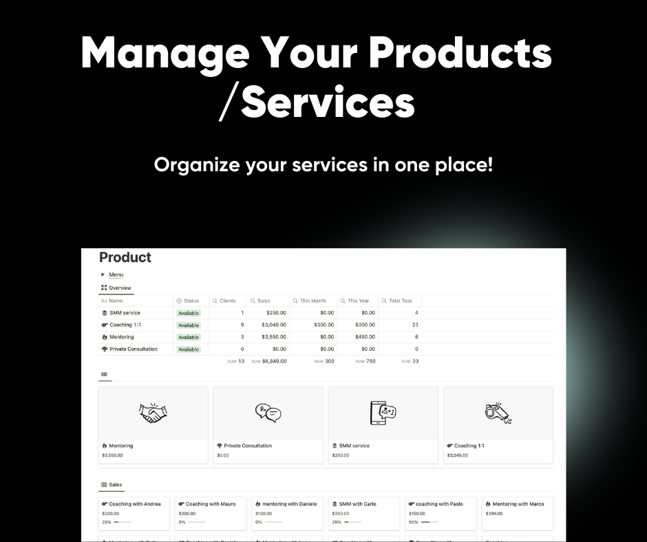 Products: there are 4 products inside that are ideal for those who sell online consulting services, SMM, Coaching, Private Consulting, Mentoring, each product is linked to the Sales database, in turn Sales is linked to the database of clients and finances, all you have to do is import your data and devote yourself to consulting! for the rest this template takes care of that!